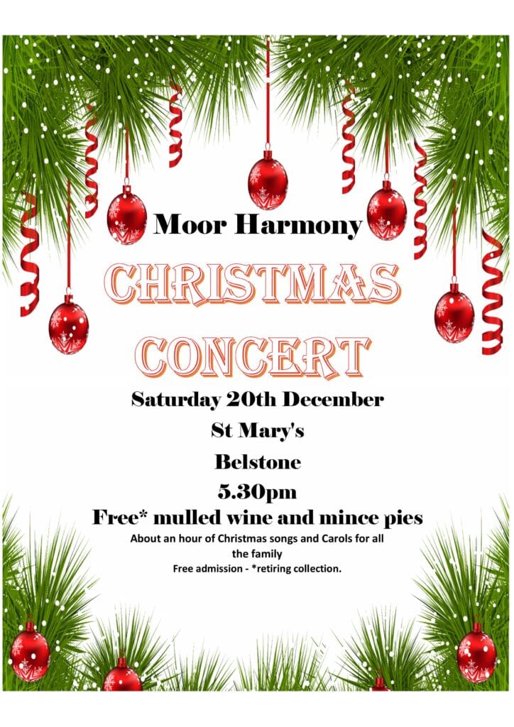 Come to St Mary’s Church, Belstone, where Moor Harmony will be back for their annual Christmas concert. Enjoy about an hour of Christmas Carols and songs for all the family, with mulled wine and mince pies.