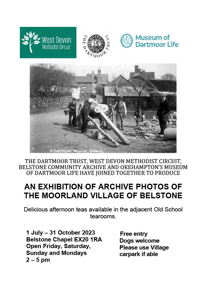 The Dartmoor Trust has joined forces with West Devon Methodist Circuit, the Belstone Community Archive and Okehampton’s Museum of Dartmoor Life to mount an exhibition of Belstone and wider-Dartmoor photos at the Methodist Chapel in the centre of the village. The exhibition runs from 1st July to the end of October and is open every Friday, Saturday, Sunday and Monday, 2pm to 5pm. Entry is free. Delicious afternoon teas will be available in the Old School Tearoom behind the chapel. Dogs welcome.
