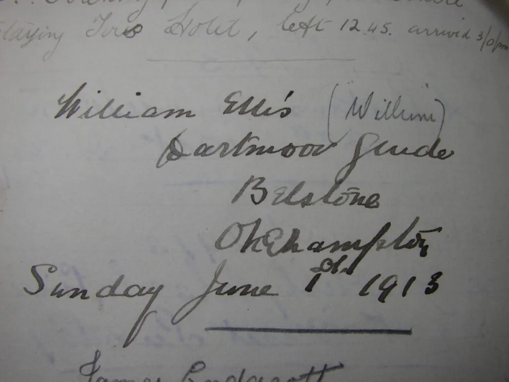 Below we have three Visitor Book entries from Belstone folk from before and just after the First World War, plus a photo taken last week of the Peatland Restoration works going on very close to Cranmere Pool.